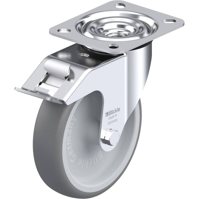 Dettagli tecnici Capacità di carico (max.) 125 kg Caratteristiche ruote con piastra avvitabile, con freno di stazionamento Colore Grigio Contenuto 1 pz. Diametro ruota 125 mm Materiale Elastomero termoplastico (TPE) Tipo prodotto Ruota girevole con fermi Ruota girevole con fermi LE-TPA 127G-FI Ruota orientabile in lamiera d'acciaio con piastra avvitabile, con fermo top-fix, Ruota con rivestimento in gomma termoplastica, con corpo ruota in polipropilene Alloggiamento: Serie LE Lamiera d'acciaio •, zincata galvanicamente, passivata blu, senza Cr6 • Doppio cuscinetto a sfere nella piattaforma girevole • Guarnizione della piattaforma girevole • Gioco minimo della piattaforma girevole, funzionamento facile, durata elevata grazie alla speciale nichelatura dinamica Ruota: Serie TPA Rivestimento •: Elastomero termoplastico di alta qualità in gomma (TPE), durezza 85 Shore A, colore grigio, senza tracce, oleoso Corpo ruota •: Polipropilene di alta qualità, infrangibile, colore grigio argento