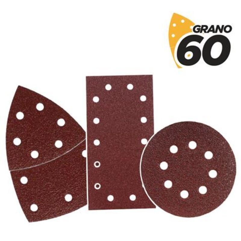 Blim 9 confezioni di platorelli in velcro per levigatrice BL0151 Specifiche: -Per la levigatrice modello BL0151. -Confezione di carta vetrata: 9 unità. -Forma: tre modelli. -Grana: 60 -Con velcro.