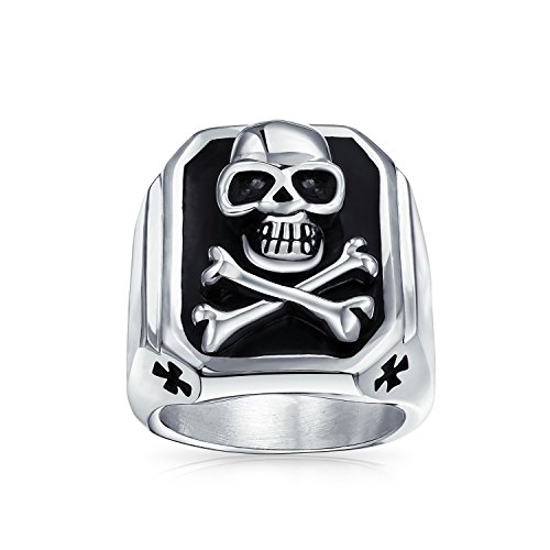 Bling Jewelry Anello Sigillo Rettangolare In Acciaio Inossidabile Tonalità Argento Con Teschio E Ossa Incrociate Di Pirati Dei Caraibi Smalto Nero Per Uomini E Ragazzi