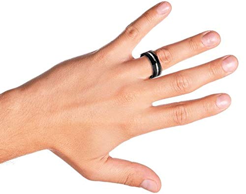 STILE STUPENDO - Per l'uomo amato della vostra vita, una splendida fede nuziale. Questa splendida fede nuziale è caratterizzata da una fascia nera con bordo lucido smussato in tonalità argento e vestibilità comoda.