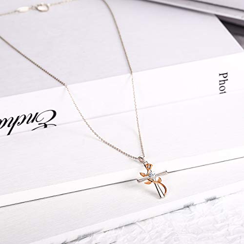BlingGem Collane da Donna in Argento Placcato Oro Rosa Fiore con Zirconia Cubica Rotonda Religiosa Croce Rosa Pendente Catena Regolabile,48 cm