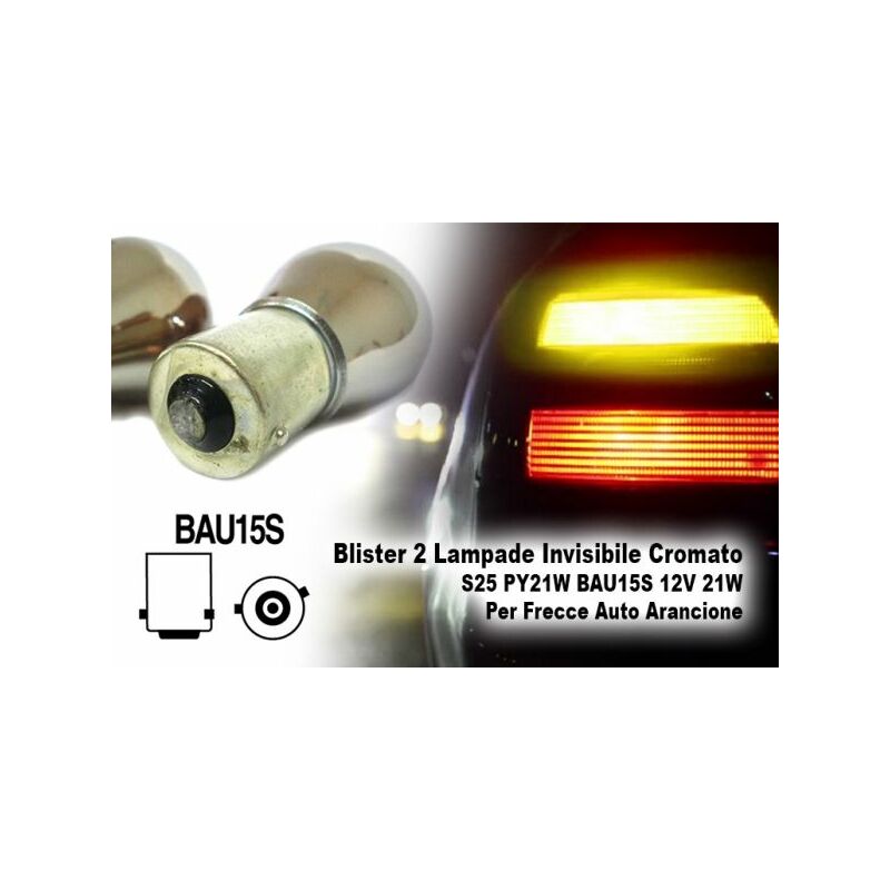 Blister 2 Lampade Invisibile Cromato S25 PY21W BAU15S 12V 21W Per Frecce Auto Arancione Blister da 2 Lampade Alogene S25 PY21W BAU15S 12V 21W Arancione - Cromate - INVISIBILI - Marca CARALL - Ottima Qualità - Vita media di circa 400 ore - Descrizione: In vendita una coppia di lampadine alogene cromate (detto modello invisibile) con attacco S25 PY21W BAU15S 12V 21W di colore Arancione: per Frecce Laterali Auto. Abbiamo a disposizione tutti i modelli di lampadina 12V e 24V: H1, H3, H4, H5, H6, H7, 12V W5W, 12V W1.2W, 12V 5W, 12V 10W, C5W 36MM, C5W 39MM, C5W 41mm, P21W, PY21W, P21/5W, W21W, WY21W, W21/5W, T4W, ecc... ecc...