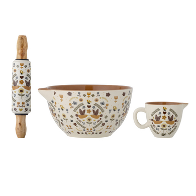 Dettagli del prodotto: Il set è composto da un mattarello, un misurino e una ciotola. Il misurino può contenere un totale di 2 dl e ha un segno per 1 dl. Viene fornito in una bella confezione regalo Materiale e cura: Materiale: 100% gres Lavabile in lavastoviglie Dimensioni e peso: Dimensioni: 21 x 12 cm Incluso nella consegna: Set da forno da 3 pezzi Attenzione: la decorazione non è inclusa