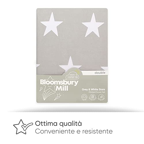 Bloomsbury Mill - Set Copripiumino e Cuscini per Letto Matrimoniale per Bambini - Copripiumino e 2 federe per Letto Matrimoniale - Stelle Grigie e Bianche - 200 x 200 cm