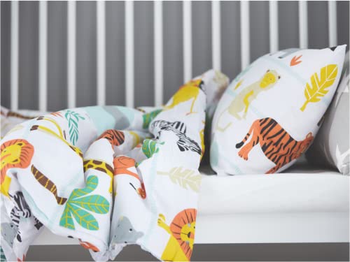 Design giocoso: il nostro vivace set da letto stampato Safari Adventure per ragazzi e ragazze presenta tutti i loro preferiti del regno animale: leoni, fenicotteri, elefanti e altro ancora. Ideale per l'uso in una culla, lettino, lettino o per piccoli esploratori nel loro lettino da viaggio.