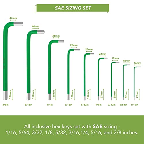 CONTENUTO DELLA CONFEZIONE: set di chiavi esagonali All Inclusive con misure metriche e SAE. Le chiavi americane di dimensioni standard includono 1/16, 5/64, 3/32, 1/8, 5/32, 3/16,1/4, 5/16 e 3/8". Questo set di chiavi alan include anche dimensioni metriche di 1,5, 2, 2,5, 3, 4, 5, 6, 8 e 10 mm.