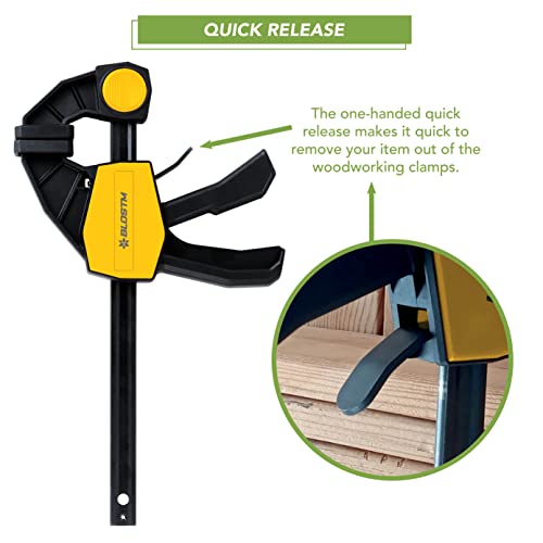 RILASCIO RAPIDO - Il rilascio rapido con una sola mano consente di rimuovere rapidamente l'oggetto dai morsetti per la lavorazione del legno. Questo è essenziale per tutti i falegnami e falegnami in modo che siano in grado di preparare il prossimo articolo sul proprio banco da lavoro senza esitazione e continuare a incollare o forare sul progetto successivo.