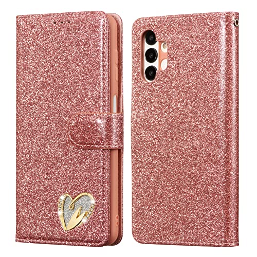 BLOTECH Brillantini Glitters Case for Samsung Galaxy A13 Custodia Bling Oro Rosa Glitter Shell Wallet PU 3D Amore Cuore Strass Cover Custodia Morbido Case Libro Leather Pelle per Samsung Galaxy A13
