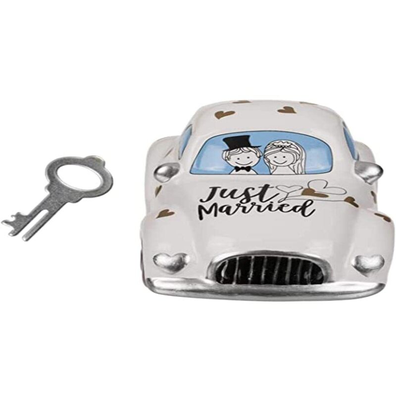 Questo salvadanaio a forma di macchina da sposa è ideale come piccolo accessorio al vero e proprio regalo di denaro. Gli sposi possono rirmiare denaro per la loro luna di miele con stile. Piggy banca era ieri, oggi ci sono le automobili di rirmio, e quindi in questo caso il consumo di benzina non è inteso sul lato inferiore è una serratura, in modo che la fortuna può essere preso, senza che l'auto deve essere rottamati. La chiave di corrispondenza è naturalmente inclusa. Materiale: ceramica lastica/metalloattenzione: non adatto a bambini al di sotto dei 3 anni a causa delle piccole parti che possono essere ingerite.