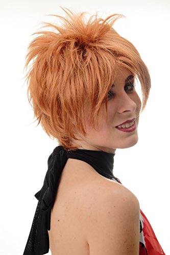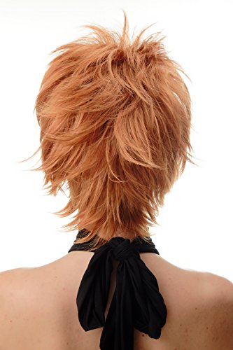Parrucca da donna corta pettinata in modo impertinente con ciocche scompigliate e cotonate, in un biondo ramato-ha qualcosa dello stile New Wave dei primi anni 80 e allo stesso tempo è sfacciata, fresca, allegra.