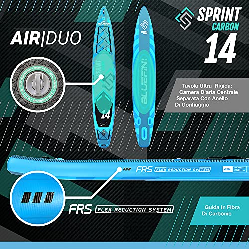TECNOLOGIA DI GONFIAGGIO AIR DUO: Il sistema di gonfiaggio doppio e indipendente è un enorme passo avanti nel mondo degli iSUP. La tecnologia Air Duo, infatti, ti permette di gonfiare la camera d'aria centrale interna, separatamente dalla camera d'aria principale esterna. Sprint Carbon galleggia anche solo grazie alla camera d'aria interna e questo è solo uno dei tanti vantaggi per la tua sicurezza.