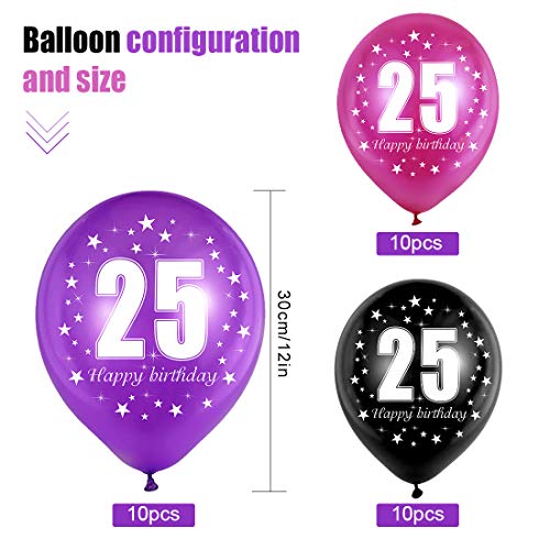 Palloncini da 30 pezzi numero 25, i palloncini in lattice sono stampati tutt'intorno con stelle buon compleanno e con 25 anni, 3 colori 10 nero, 10 viola e 10 rosso.
