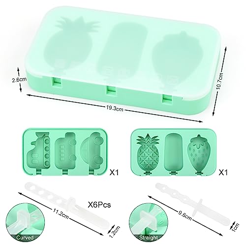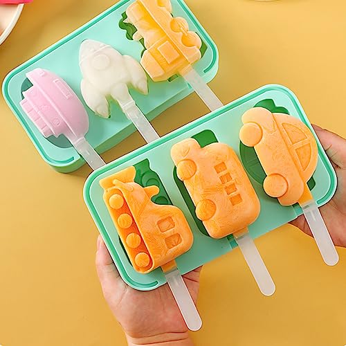 Bluelves Stampi per Ghiaccioli,2 Pezzi Formine Ghiaccioli Riutilizzabili, Silicone Stampi per Gelato Senza BPA, Stampo Ghiaccioli con Bastoncino per Bambini Adulti(La Frutta + Veicoli)