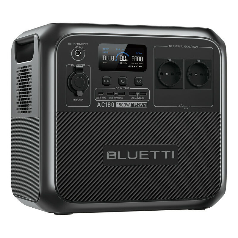 BLUETTI Generatore solare AC180 [1440W Ricarica Rapida] - Senza un adattatore ingombrante, un solo cavo può ricaricare il BLUETTI AC180 con un ingresso AC da 1440W e riempire questa stazione di energia da 1152Wh in meno di 1 ora. [9 Uscite Versatili] - Potenza di uscita 1800W - include AC presa, USB-A, Type-C e carica wireless. Sono supportate tutte le spine dei dispositivi. Per i carichi resistivi puri, l'uscita AC può arrivare a 2700W. [Ricarica Veloce Solare] - Il regolatore di carica MPPT incorporato per un'energia solare fino a 500W consente una ricarica completa in 2,8-3,3 ore. 0-100% in 1 ora dalla ricarica AC+PV con un ingresso massimo di 1800W. [UPS Affidabile] - AC180 è dotato di una funzione UPS avanzata che ripristina l'alimentazione istantaneamente con un tempo di commutazione di 20 ms, senza temere interruzioni di corrente. [Cosa Ottieni] - BLUETTI AC180 Centrale elettrica portatile, cavo di ricarica AC, adattatore di ricarica per auto, cavo di connessione solare