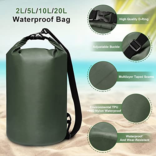 Taglie multiple: 4 taglie (2L / 5L / 10 / 20L) tra cui scegliere, una scelta giusta per i viaggi all'aperto e gli sport acquatici. Ogni borsa impermeabile viene fornita con una custodia per cellulare impermeabile gratuita, che ti offre protezione impermeabile per ogni oggetto che porti.