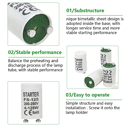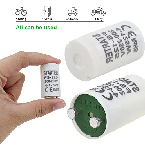 Fornitura: 10 pezzi di starter per tubi fluorescenti. 4-125W, 200-240V. L'alta e la bassa tensione si avviano rapidamente. Dimensioni: 20 mm * 40 mm.