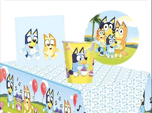 Bluet Party - Confezione da tavola per 16 ospiti, contiene piatti bluey, tazze, tovaglioli blu