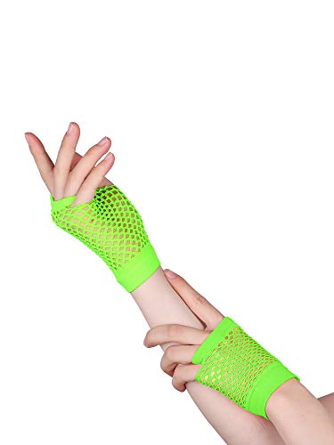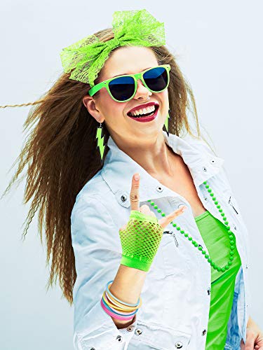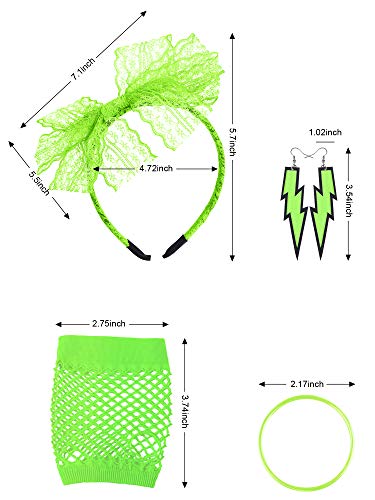 Confezione: la confezione per feste anni '80 comprende 1 paio guanti a rete senza dita, 1 paio di orecchini verdi fluorescenti vintage e 1 pezzo di fascia in pizzo, 1 pezzo di collana verde fluorescente e 10 pezzi di braccialetti in silicone;