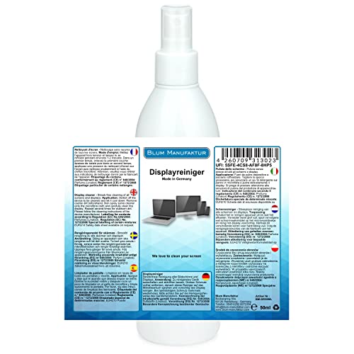 Blum Manufaktur - Detergente per display da 50 ml + panno in microfibra da 30 x 30 cm - Detergente per schermo per la pulizia senza aloni di tutti gli schermi e display.