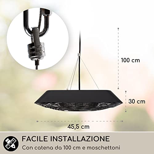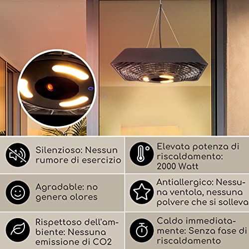 MONTAGGIO A SOFFITTO: Il riscaldamento a infrarossi Blumfeldt Heat Square può essere facilmente montato a soffitto con una catena da 100 cm, in modo da non intralciare, riscaldando voi e i vostri ospiti in modo rapido ed efficiente fino a 2000 watt dall'alto.