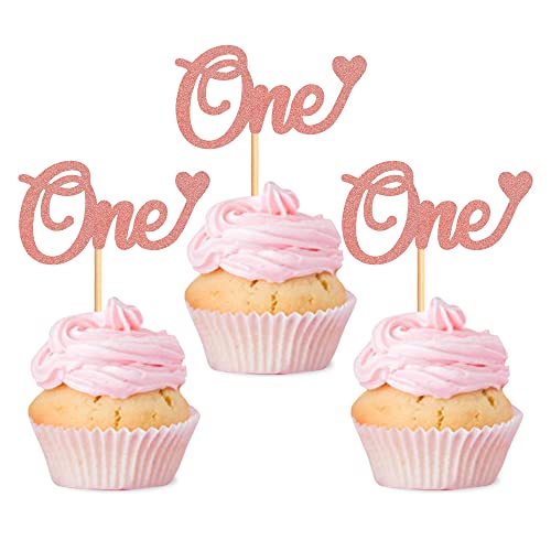 Blumomon 24 topper per cupcake glitterati per il primo compleanno, per cupcake, decorazioni per baby shower, ragazzi, ragazze, bambini, 1° compleanno, decorazioni per torte, colore: oro rosa