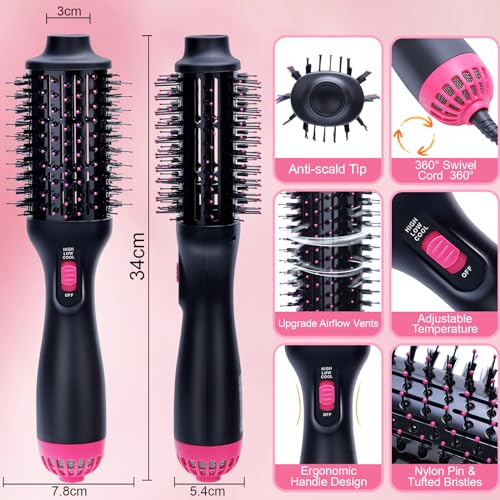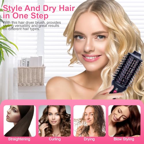 Spazzola ad aria calda multifunzionale 4 in 1: combina perfettamente asciugatrice, pettine, piastra e arricciacapelli. La spazzola per asciugacapelli assicura di asciugare i capelli e nel frattempo può rendere i capelli arricciati o lisci. Potenza di asciugatura massima di 1000 W con meno effetto crespo e aiuta a ridurre i danni ai capelli. Semplifica l'asciugatura e lo styling a casa.