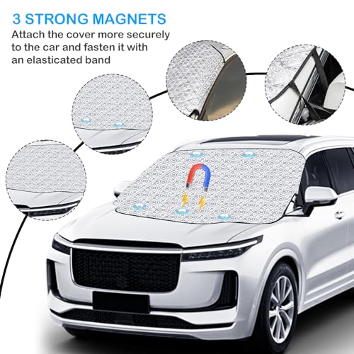 【Adsorbimento Magnetico】5 magneti ingranditi sui bordi inferiori mantengono la copertura saldamente sul parabrezza e non causano alcun graffio. Due orecchie sono fissate al centro della portiera per evitare che la copertura venga rubata e per mantenere il veicolo più sicuro.