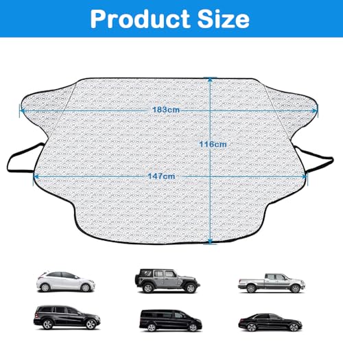 【Dimensioni Universali】Lunghezza totale 183*147*116CM, copre perfettamente l'intera copertura del parabrezza e parte del cofano, la copertura del parabrezza si adatta alla maggior parte delle auto, la copertura del parabrezza dell'auto viene fornita con una spazzola da neve e un panno per auto per tutte le vostre esigenze.