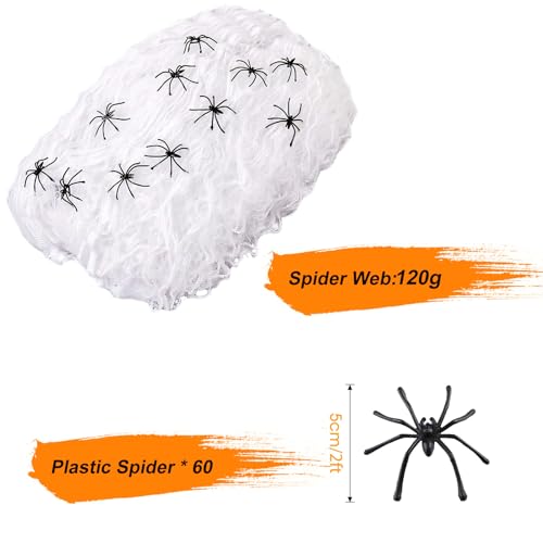 BNGXR Ragnatela di Halloween, Ragnatela 120g con 60 Ragni Falsi, Ragnatela per Decorazioni spaventose per Feste di Halloween