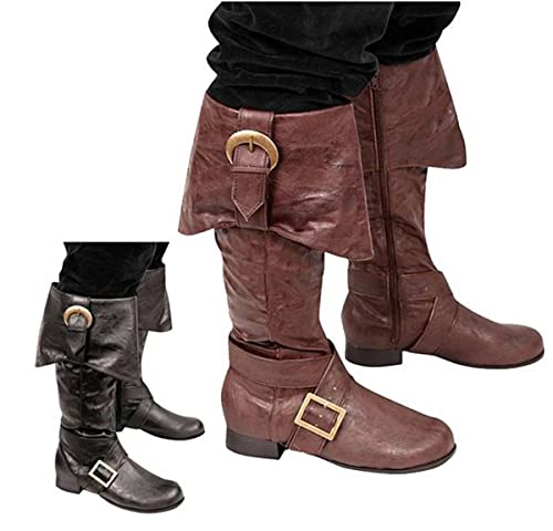 Bnjghcug Vichingo Pirata Soldato Cavaliere Stivali in Pelle Pu - Stivale Vintage Medievale per Uomini Adulti - Cosplay Halloween Uomo Donna Moda Fibbia Scarpe Stivale,Marrone,43