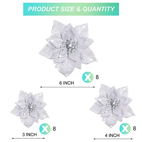 Contenuto della confezione: la confezione include 24 fiori di Natale glitterati in argento, 3 diverse misure e ogni dimensione ha 8 pezzi, quantità sufficiente per soddisfare le vostre esigenze decorative