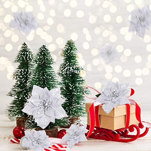 Boao 24 Pezzi Fiori di Natale Artificiali Stella di Natale Glitterata Decorazioni Stella di Natale Ornamenti dell'Albero di Natale di Matrimonio, 3/4/ 6 Pollici (Argento)