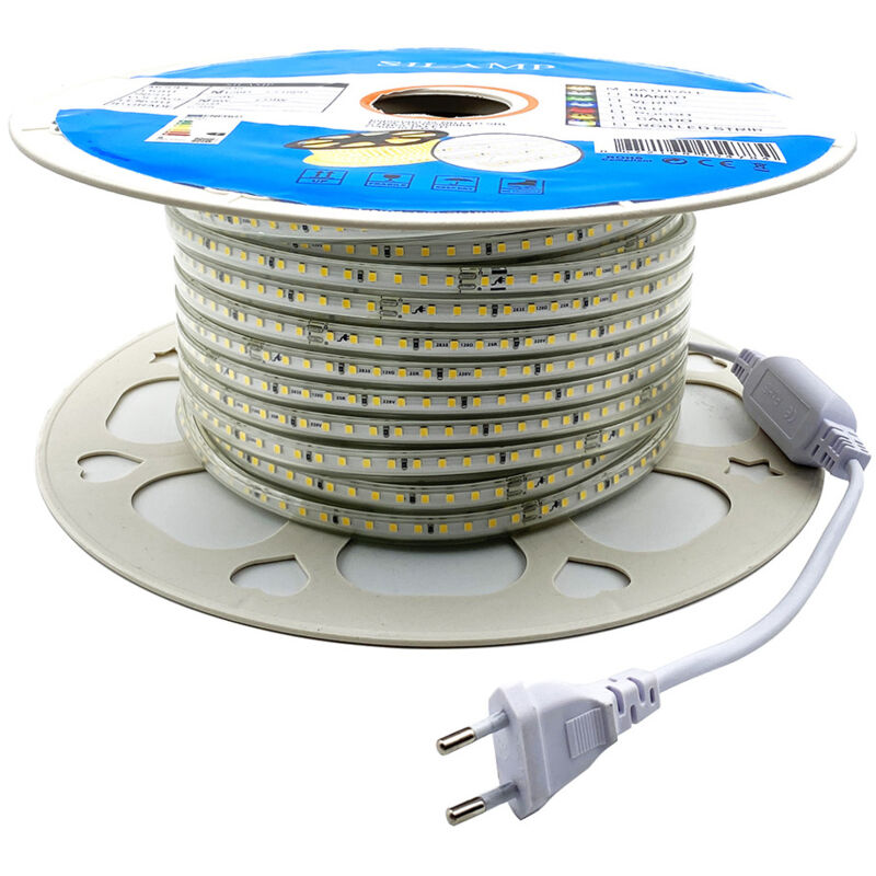 BOBINA 50M STRISCIA LED SLIM 5 MM 220V 8W/M 120 LED/M IP65 S32 SILAMP La nuova bobina led 2835 ad alta efficienza consuma solo 8W per metro. La luce che emette è distribuita con un angolo di 120°. Questa striscia LED 220V può essere tagliata ad ogni 20 cm, negli spazi adibiti al taglio, ossia dove troverete le interruzioni della striscia led. Per una perfetta protezione IP65, questi punti di connessione devono essere adeguatamente protetti. La striscia a led NON è adesiva, inclusa nella confezione troverete delle clips di fissaggio. Inoltre, ogni bobina è compresa di 3 cavi raddrizzatori e 3 tappi terminali. La strip LED 220V è perfetta per decorare sia spazi esterni che interni, può essere utilizzata per illuminare facciate, vetrine o armadi, scaffali, soffitti o scale ed altri usi. AVVERTENZA: Non provare la bobina ancora arrotolata per più di 5 minuti, essendo molto potente il calore si accumulerebbe e ci sarebbe il rischio che danneggi l'intera bobina. Pertanto, è consigliabile
