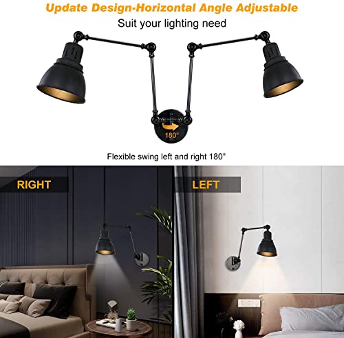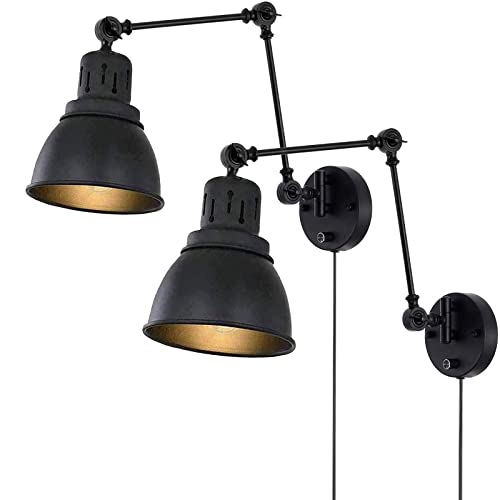 BOBOPAI Applique da Parete Regolabile Vintage con Interruttore, Lampada da Parete Girevole Industriale Retrò con Spina, Illuminazione da Parete per Interni E27 per Soggiorno, Ufficio, Nero, 2 Pezzi