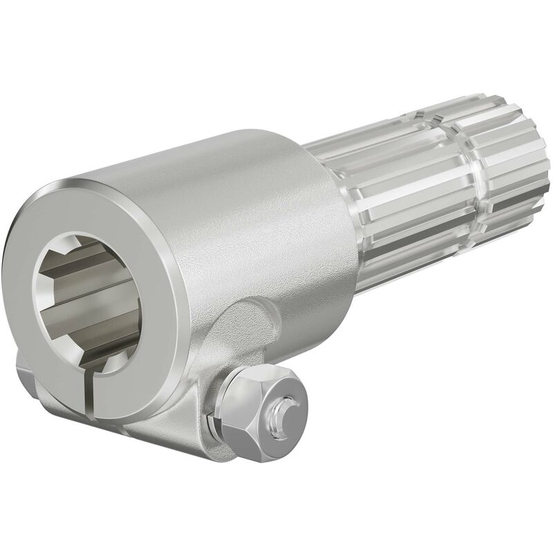 Boccola per albero cardanico Lunghezza: 175 mm Attacco albero scanalato: 1⅜″, 6 scanalature Attacco albero di uscita: 1¾″, 20 denti Diametro: 36 mm (interno, con scanalature), ø 44,3 mm (esterno, con denti) Un albero cardanico (anche detto albero presa di forza) di alta qualità è un elemento essenziale nel settore agricolo, poiché trasmette la potenza del trattore a diversi tipi di macchine agricole. Un componente spesso indispensabile per la trasmissione di potenza è la boccola del cardano come adattatore con due lati di collegamento. Un lato presenta un profilo maschio o esterno, l'altro un profilo femmina o interno. Questo pezzo di collegamento viene utilizzato per collegare il cardano del trattore e l'albero cardanico in modo da poter azionare un attrezzo trainato. Il pezzo viene spinto su entrambe le estremità, le scanalature del profilo interno impediscono all'albero di ruotare. Il numero di denti e scanalature nel profilo interno ed esterno della boccola può variare. Il nostro