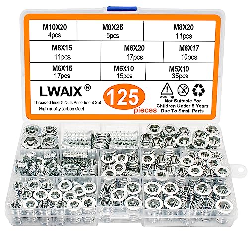 IL PACCHETTO INCLUDE: Il boccola filettata include dadi da 125 pezzi,di cui 9 dimensioni, M5 * 10 (35 pezzi), M6 * 10 (10 pezzi), M6 * 15 (17 pezzi), M6 * 17 (10 pezzi), M6 * 20 ( 17 pezzi), M8 * 15(11 pezzi), M8 * 20 (11 pezzi), M8 * 25(5 pezzi), M10 * 20(4 pezzi). C'è anche una scatola di immagazzinaggio per un facile smistamento e utilizzo. Non devi preoccuparti di confonderli. per soddisfare le vostre diverse esigenze.