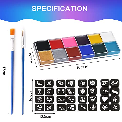 Body Painting Colori,Face Painting Bambini Colori 12 Colori 2 Pennelli Pintura para Pintar Barriga Embarazada Trucchi Carnevale Colori Modelli di Motivi Compleanno Halloween Santa Feste Body Painting