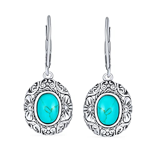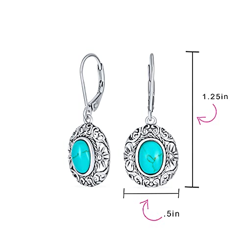 Boho Bali Balinese Stile Floreale Scroll Milgrain Semi Prezioso Stabilizzato Blu Turchese Cupola OvalE Penzoloni Gocce Orecchini Per Donna Leva Ossidato .925 Sterling Argento
