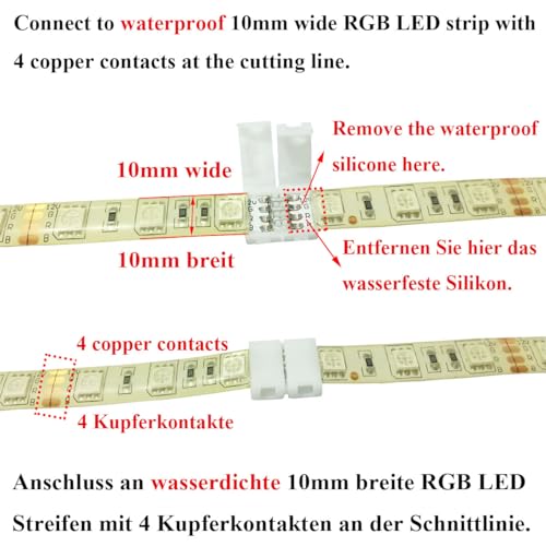 Connettore rapido a 4 poli per strisce LED RGB 5050 da 10 mm di larghezza con 4 contatti (+, B, R e G). Questi connettori vengono utilizzati per collegare due strisce LED RGB 5050 da 10 mm di larghezza.
