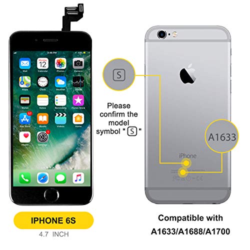 【Compatibile con iPhone 6s】- Questa sostituzione dello schermo LCD funziona solo con un iPhone 6s (4,7 pollici). Controlla il retro del telefono se non conosci il modello di telefono. Puoi cercare il tuo modello di telefono su Google per assicurarti che il tuo telefono sia iPhone 6s o meno. Riconosci il tuo modello di iPhone prima dell'acquisto.