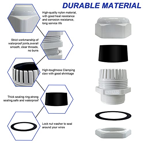 Applicazione: connettore per cavi in nylon per tutti gli accessori elettrici resistenti alle intemperie come prese, interruttori, scatole di giunzione, pannelli di distribuzione, fissaggi per cavi, ecc. Forte resistenza allo stretching, nessun danno a cavi o dispositivi.