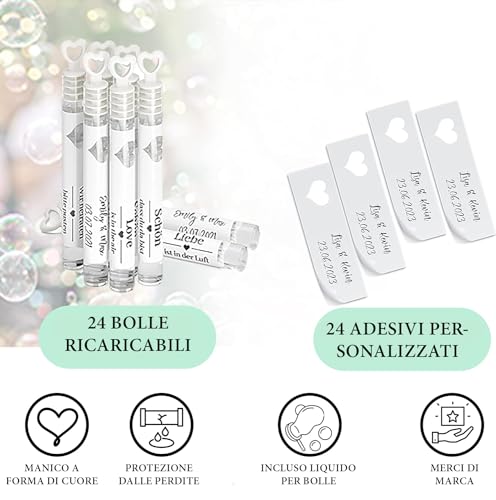 B4P Set di bolle di sapone per matrimonio, con adesivo personalizzato, 24 pezzi, con manico a cuore, per matrimonio, bomboniera, battesimo, compleanno, matrimonio, fidanzamento, San Valentino
