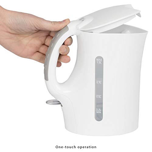 Bollitore - Colore: bianco - Capacità fino a 1,0 litri - Coperchio di sicurezza con funzionamento a una mano - senza fili - Elemento riscaldante in acciaio inossidabile - Filtro anticalcare rimovibile - Spegnimento automatico e manuale - 2 indicatori esterni del livello dell'acqua - Protezione contro il funzionamento a secco e il surriscaldamento - Interruttore on/off illuminato - Impugnatura gommata antiscivolo