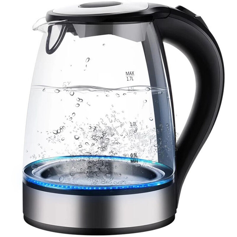 Caratteristiche: Cool Touch con la sua doppia parete:La sicurezza è di fondamentale importanza. Bollitore elettrico con strato interno in vetro PYREX, strato intermedio in aria, strato esterno in plastica resistente. Previene efficacemente le ustioni causate dal contatto o dalla rottura della superficie calda del bollitore elettrico, Proteggi la salute di te e della tua famiglia. e bolle rapidamente in pochi minuti fino a 1850 W, risparmiando tempo per preparare una tazza di acqua, tè caldo o caffè. Il bollitore dell'acqua calda si spegnerà automaticamente una volta che l'acqua sarà bollita. Quando l'acqua è quasi asciutta, il bollitore elettrico in vetro proteggerà dal surriscaldamento e si spegnerà automaticamente. la base girevole a 360 gradi e ha un fondo isolato che rimane fresco per un facile trasporto. Facile da usare e da pulire:Una bocca larga significa sia facile pulizia che riempimento. Per rimuovere depositi minerali o macchie di ruggine dall'interno del bollitore, unire