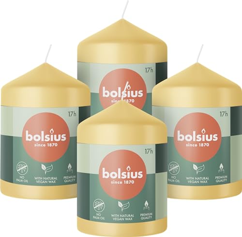 Bolsius Candele a pilastro, beige, confezione da 4, 8 x 6 cm, candele decorative per la casa, lunga durata di 17 ore, non profumate, 5% cera vegana naturale, senza olio di palma