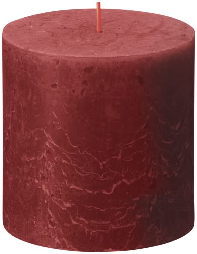 La candela Bolsius Rustik XXL in tonalità rosso scuro rosso tenero ha un'altezza di 10 cm e brucia fino a 62 ore