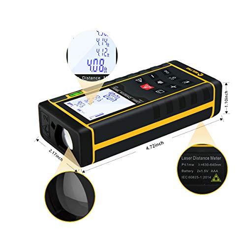 Retroilluminazione LCD e cambio unità: quattro linee di display LCD e schermo retroilluminato ad alta definizione offre una migliore visibilità nelle zone scure. Unità di regolazione gratuita tra m/in/ft/ft+in per le vostre esigenze.