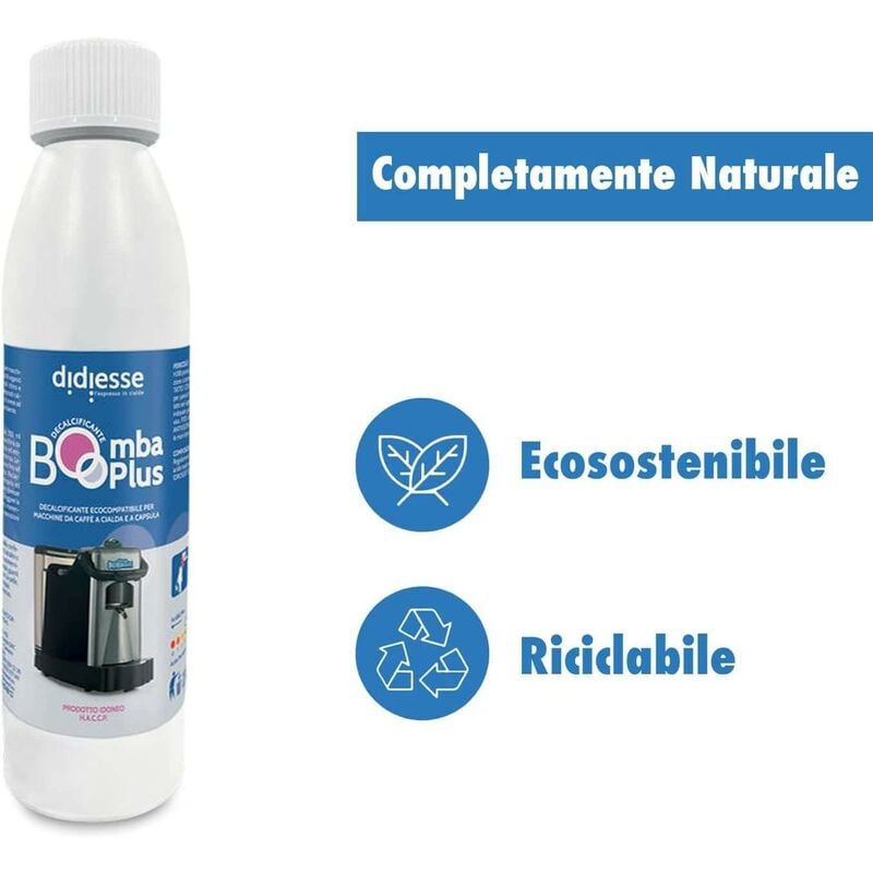 Ricambio Originale Didiesse Bomba Plus Il decalcificante Bomba Plus è un prodotto professionale ed ecocompatibile ideale per macchine da caffè a cialda e a capsula. La Bomba Plus è disponibile nel pratico flacone da 250 ml in confezioni da 4 flaconi. Modalità d?utilizzo: 1. Estrarre il serbatoio, vuotarlo se pieno, versare al suo interno l?intero contenuto del flacone di decalcificante senza diluirlo. 2. Riposizionare il serbatoio nell?apposita sede e premere il pulsante di erogazione in modo da far scorrere la soluzione all?interno della macchina. 3. Prelevare gradualmente la soluzione decalcificante per mezzo di un contenitore posizionato sotto il beccuccio di erogazione caffè. 4. Erogare il decalcificante, circa 75 ml per volta ad intermittenza, lasciandolo agire per circa 5 ? 10 minuti e ripetere l?operazione fino all?esaurimento della soluzione decalcificante. 5. Estrarre il serbatoio, lavarlo con acqua corrente e riposizionarlo nell?apposita sede. 6. Erogare circa 1 serbatoio di