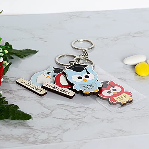 Bomboniera Portachiavi Laurea Gufo Celeste in Legno con Anello e Catenella Made in Italy ideale per Confettata e Bomboniera Laurea Dottore