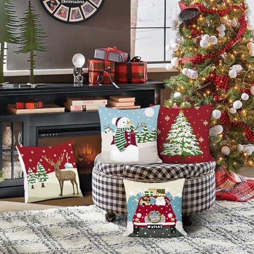 Bonhause Federe Cuscini Natalizi Renna 45x45cm Copricuscini Decorativi Albero di Natale Camion Pupazzo di Neve Velluto Morbido Federa per Cuscino Divano Letto Casa Decorazione Natalizia Set di 4
